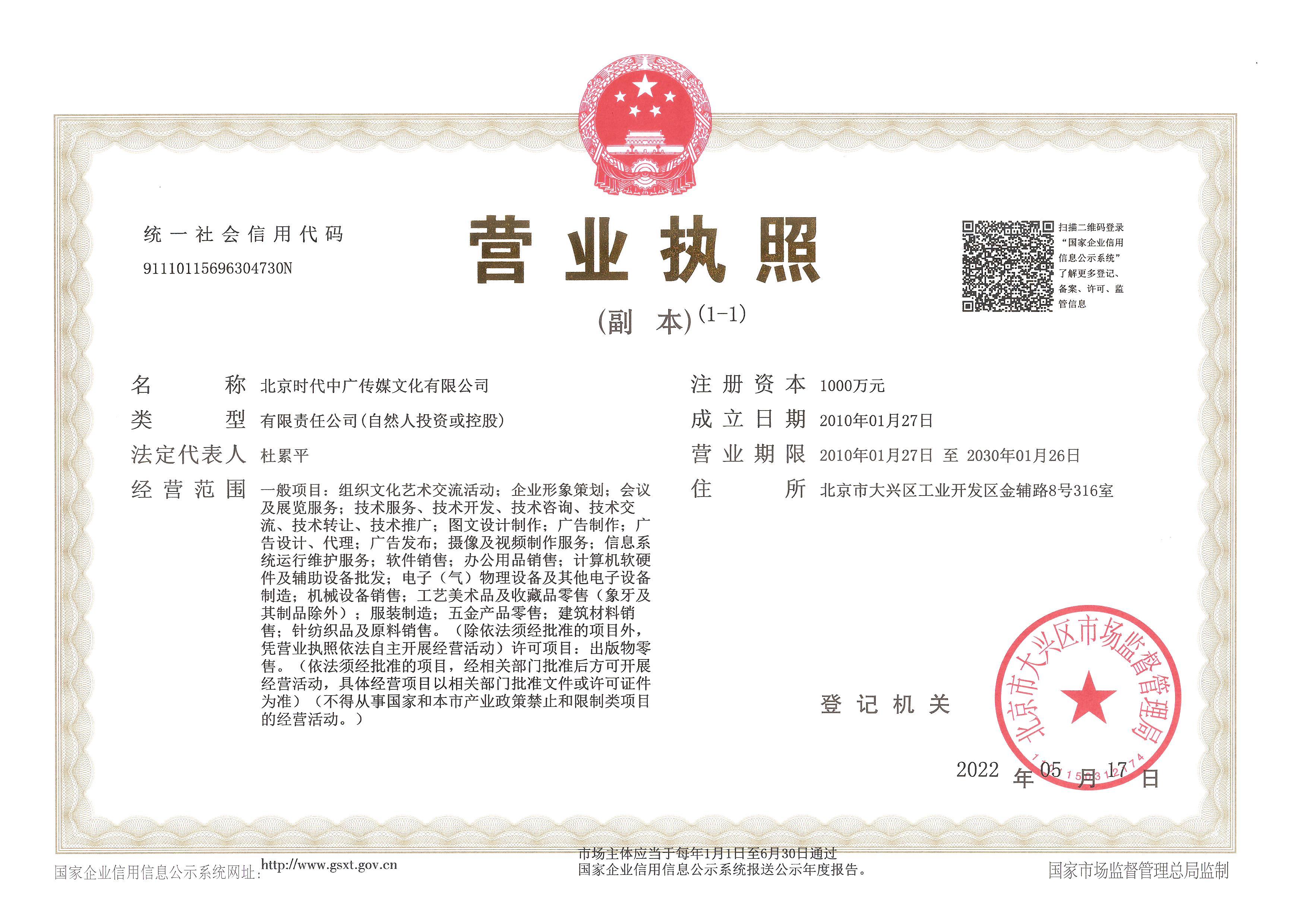 | 单位全称: | 北京时代中广传媒文化有限公司 | ||