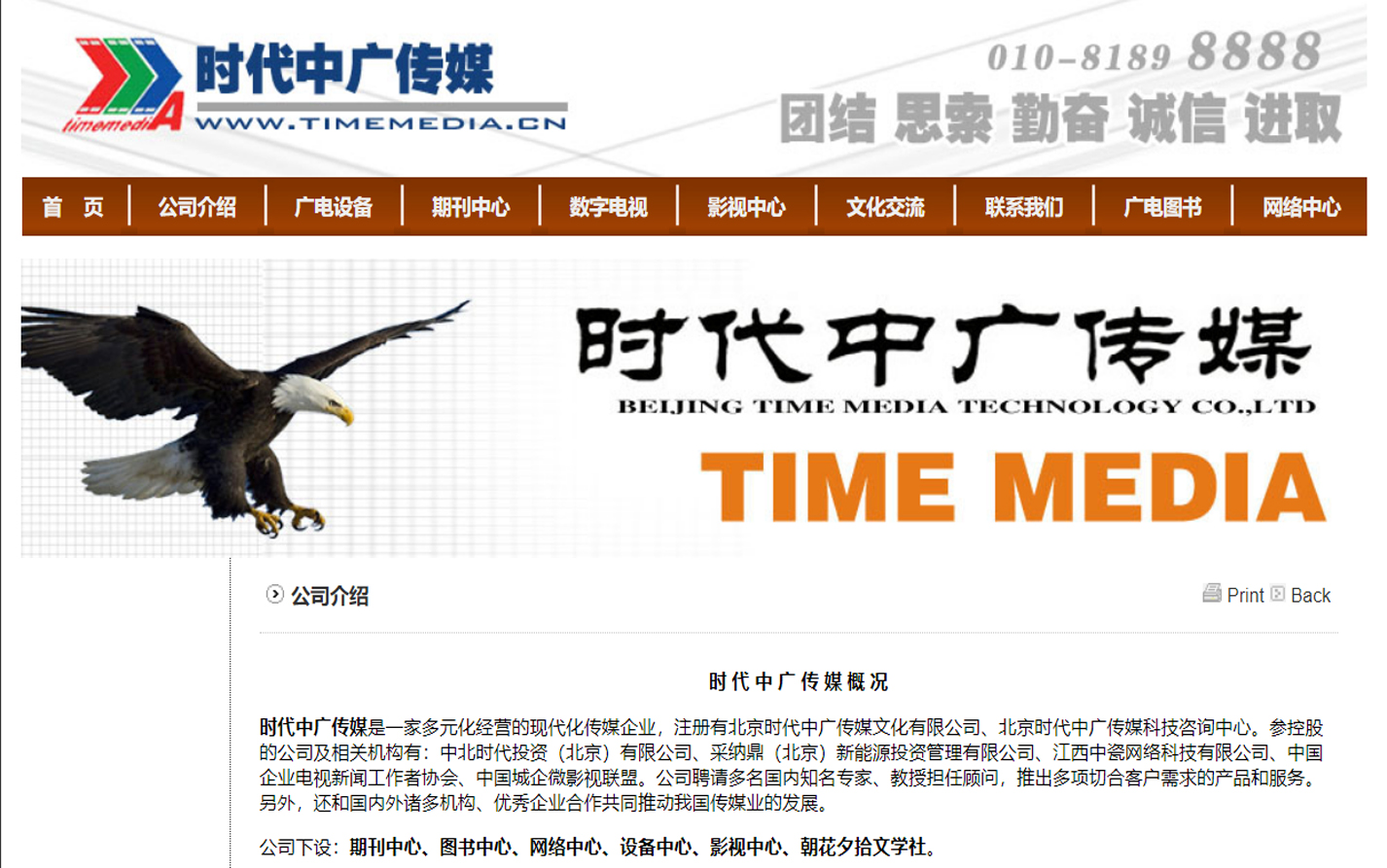 | 企业简介: | 时代中广传媒(www.timemedia.cn)是一家多元化经营的现代化传媒企业,主要致力于广播电视行业的文化交流、技术咨询、方案设计、信息传播、影视剧制作、发行及广播电视设备销售、工程施工等。公司下设:期刊中心、图书中心、网络中心、设备中心、影视中心、朝花夕拾文学社、综合办公室等。 |