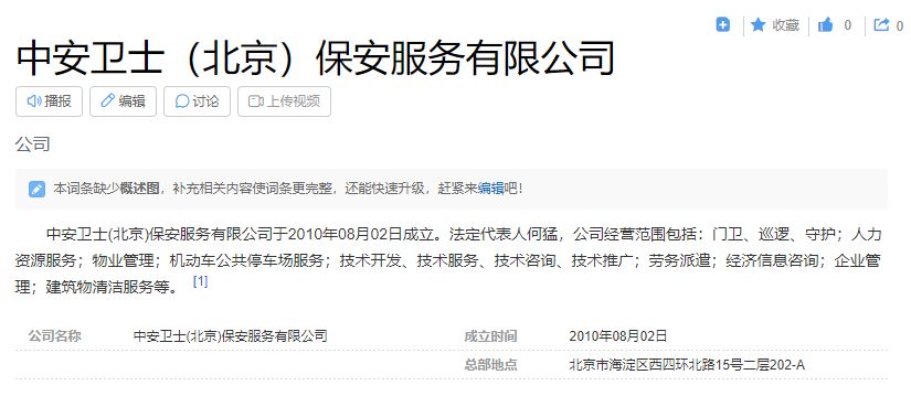 | 单位全称: | 中安卫士(北京)保安服务有限公司 | ||