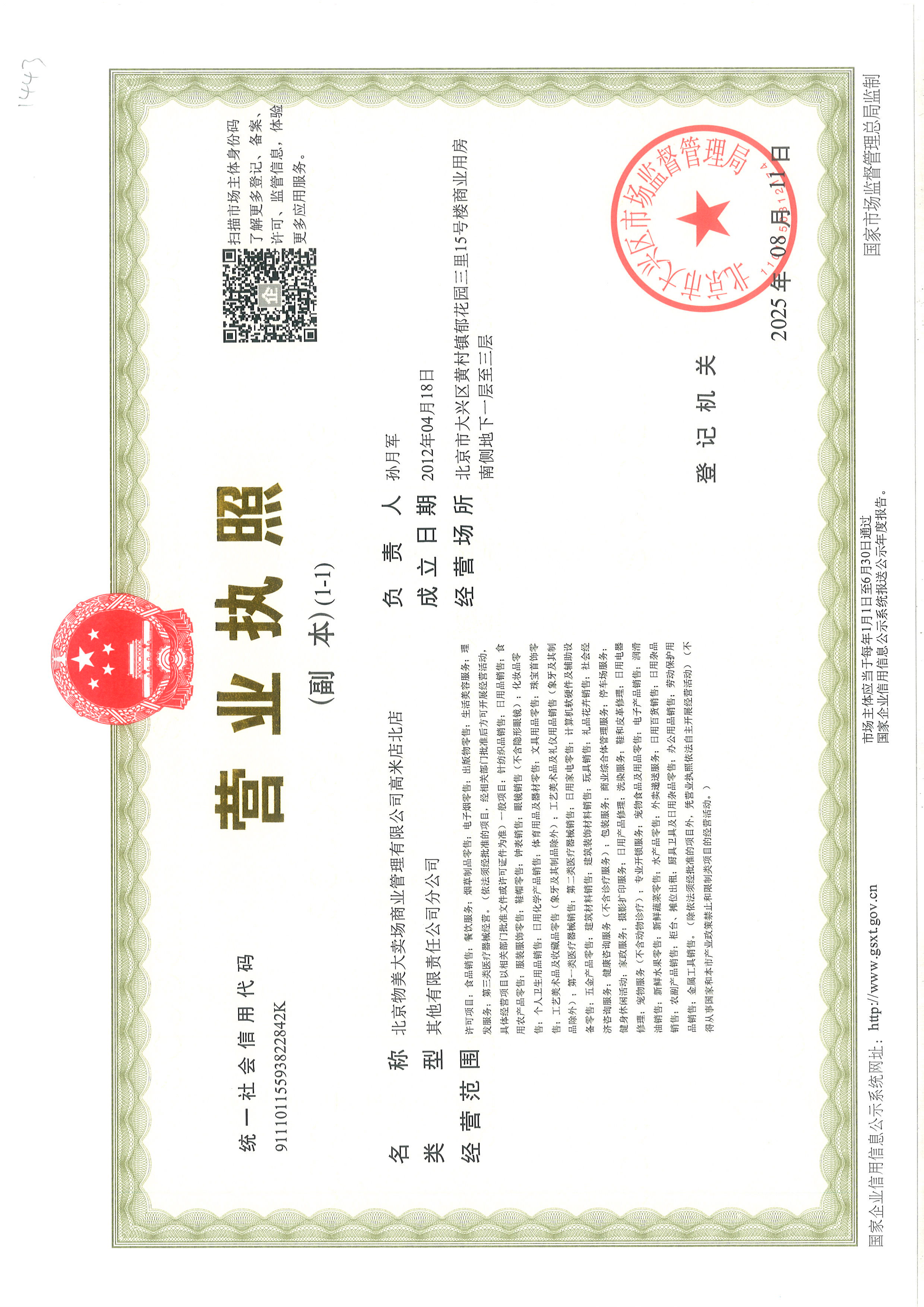| 单位全称: | 北京物美大卖场商业管理有限公司高米店北店 | ||