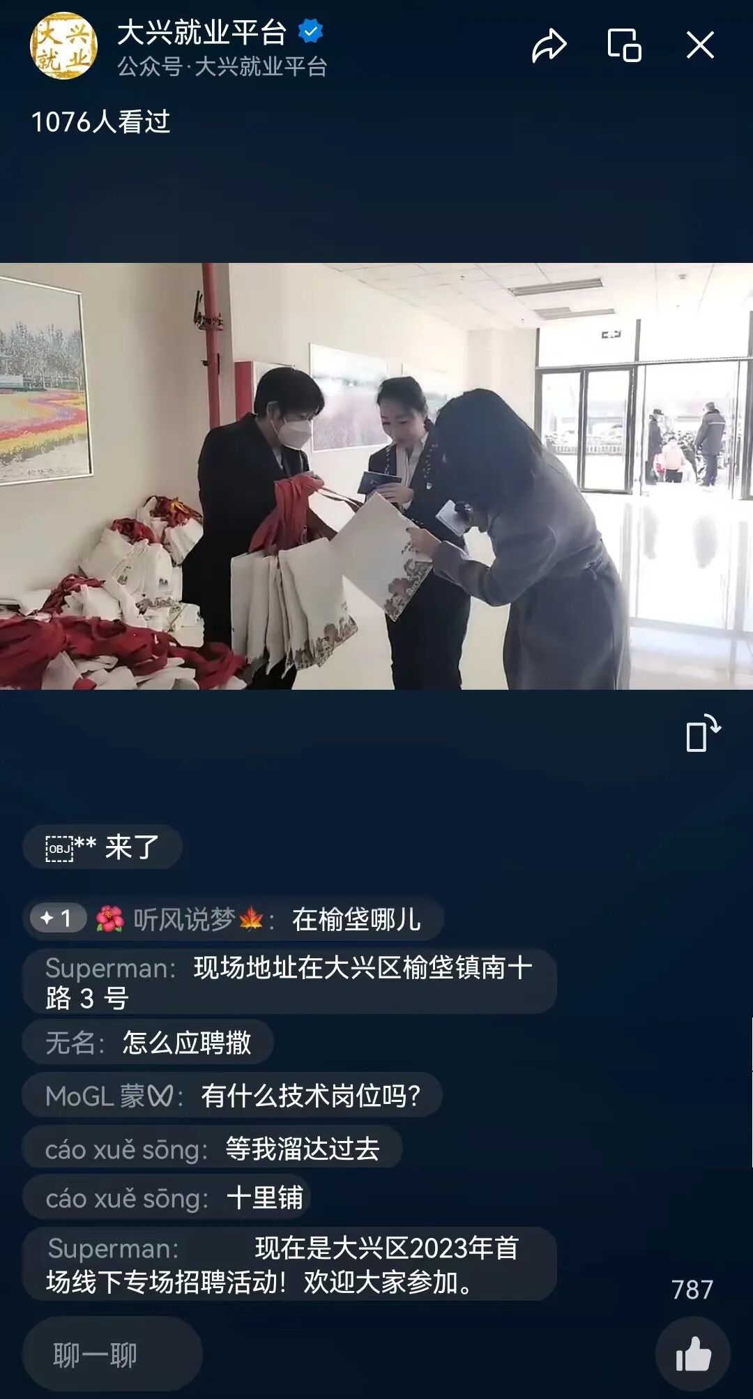 本场招聘会是大兴区今年举办的第一场现场招聘会。招聘活动通过北京大兴客户端、“这里是大兴”视频号、北京大兴微博、大兴就业平台视频号等多媒介进行直播,依托大兴就业平台网站开通网络报名,让不能到现场参加活动的求职者也可通过直播间链接和“大兴就业平台”在线投递简历。